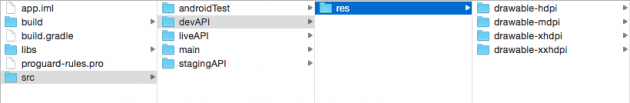 Next, to be able to differentiate all the builds after they've been installed, we give them each a different app icon. This is done by creating a src folder for each flavour and defining a res folder with drawables folders: